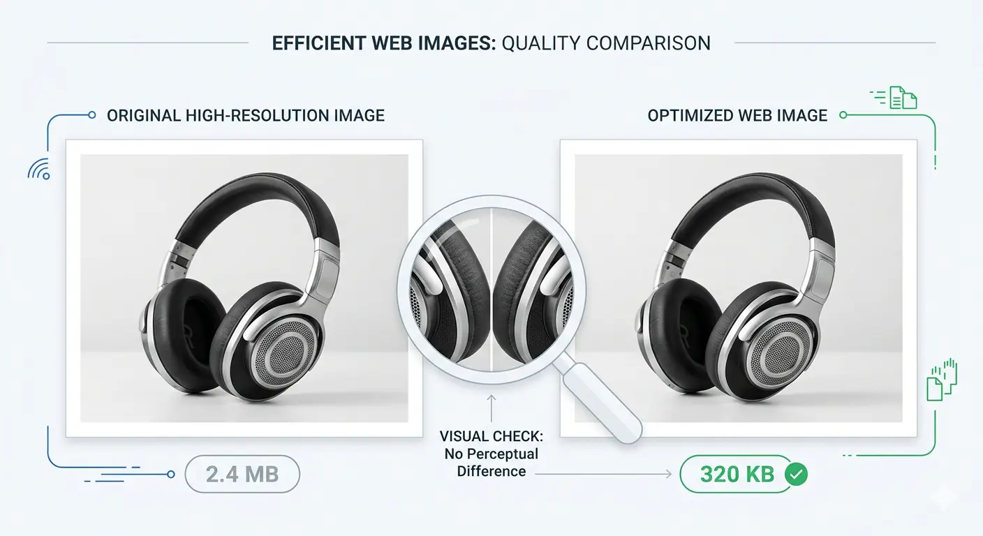 Format selection is the second variable that most people skip. If an image is currently a JPEG, converting it to WebP at the same quality setting produces a file 25–35% smaller with no perceptible quality difference. If it is a PNG graphic that does not require transparency, converting to lossy WebP at quality 80 can reduce it by 60–80%.